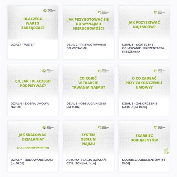 Ponad 15h godzin nagrań wideo (59+ lekcji wideo podzielonych na 7 modułów) − cała niezbędna wiedza dotycząca obsługi mieszkań.
